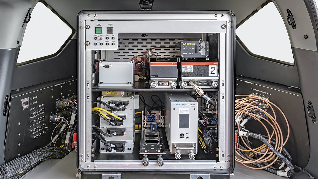The extra compact FIS module is located in the mission equipment compartment of the DA62, right behind the operator seat, and is wired up to the mission power panel and the dedicated antenna connection panel. This modular design and the pre-installed antennas enable an easy configuration change from e.g. ISR to FIS in less than a day. The operator laptop, directly connected to the CARNAC XS, allows real time analyses of the measurements taken by the calibration bench and the pilot tablet allows a live monitoring of the flight relevant data. With additional radios and audio panels, the operator has all the capabilities to ensure safe communication on board and, at the same time, direct connection to the ground crew.