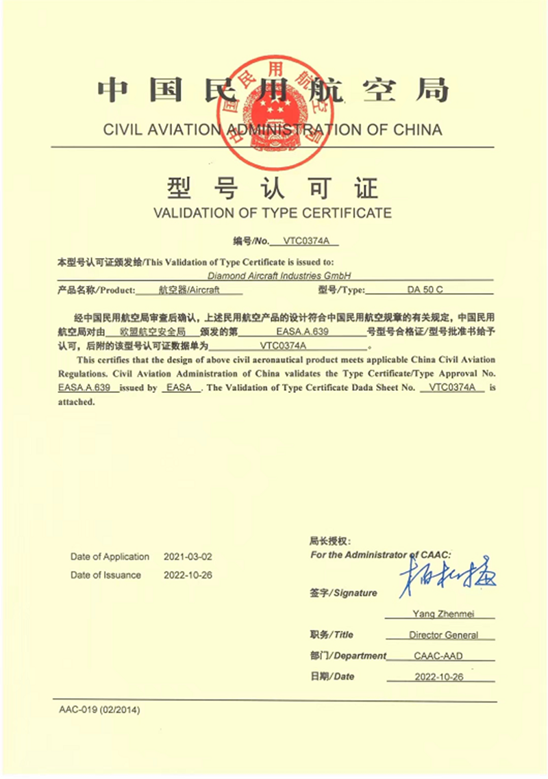 10月26日,z6尊龙·中国官方网站钻石DA50飞机通过中国民航局全部的技术验证,完成中国型号认可证(VTC)取证。