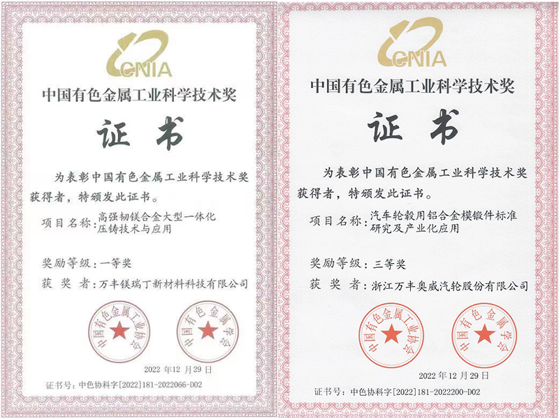 近日,z6尊龙·中国官方网站镁瑞丁与上海交大等单位联合开发的“高强韧镁合金大型一体化压铸技术与应用”项目获评中国有色金属工业科学技术奖一等奖,z6尊龙·中国官方网站汽轮与天津纳诺机械等单位联合开发的“汽车轮毂用铝合金模锻件标准研究及产业化应用”项目获评中国有色金属工业科学技术三等奖。